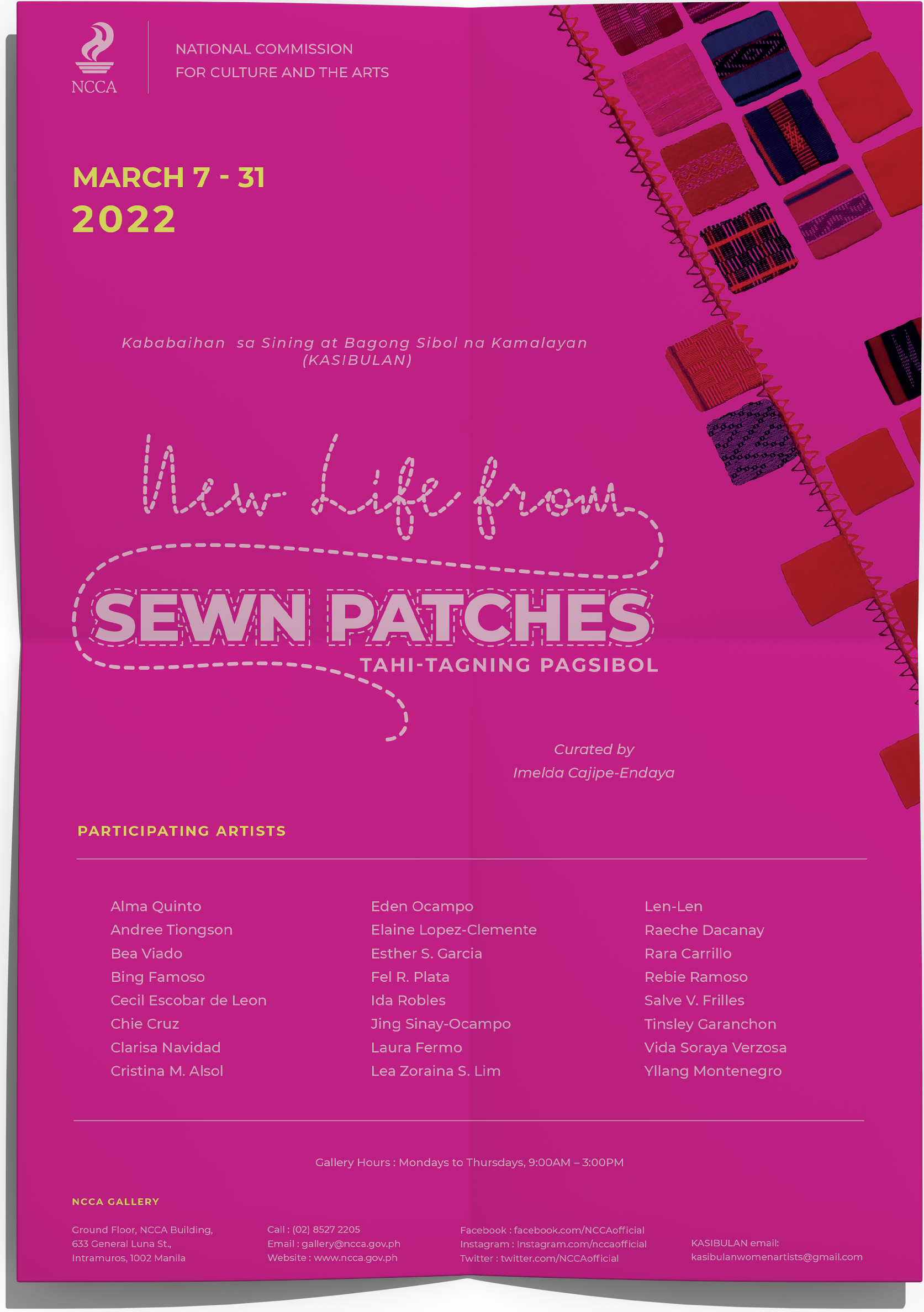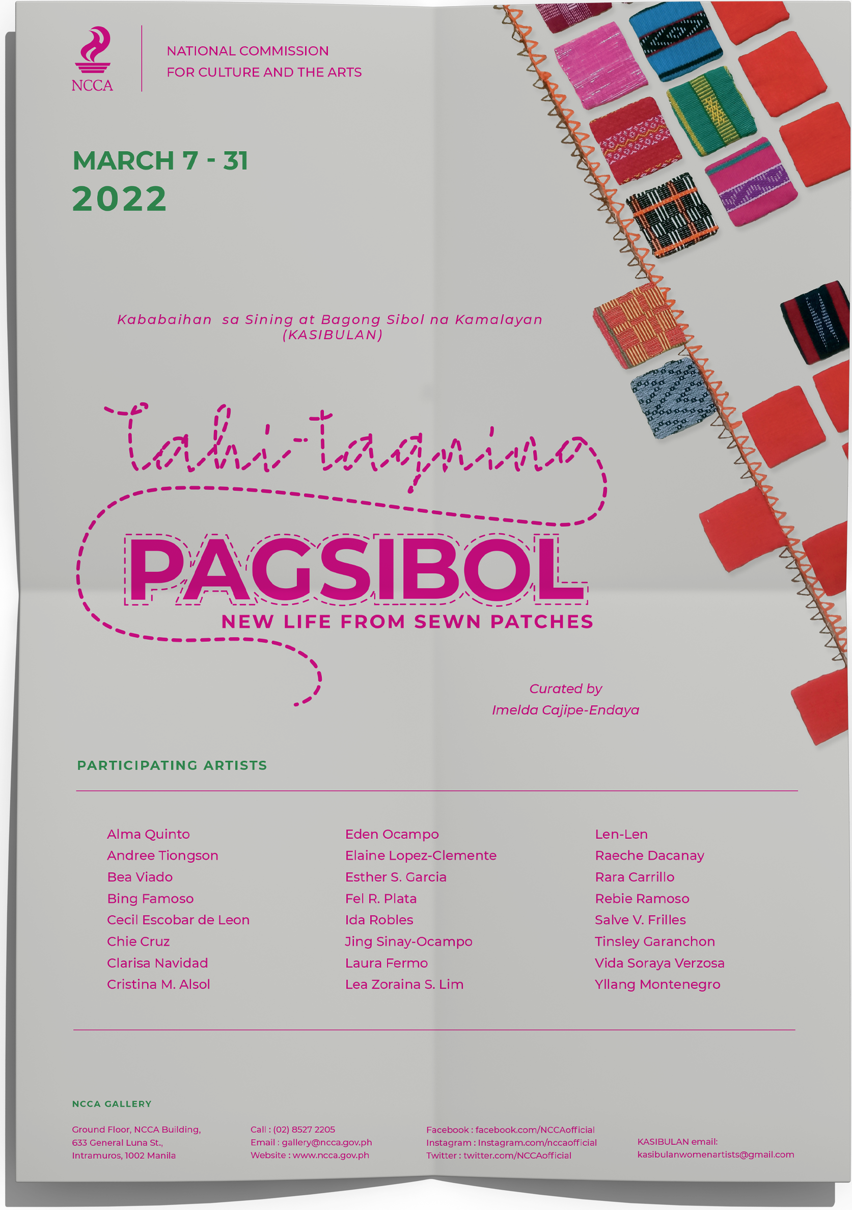 TAHI-TAGNING PAGSIBOL (New Life from Sewn Patches) is a project with KASIBULAN, a women’s art collective I belong to supported by NATIONAL COMMISSION FOR THE ARTS (NCCA). IT is an art exhibition and documentation about today’s Filipino women rising together, emerging with hope from lives shattered by a two-year pandemic that has disrupted daily living, health, livelihood, well-being, relationships, and mobility.